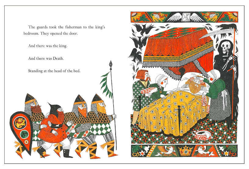 En 1812, les frères Grimm publient le recueil Contes de l’enfance et du foyer dans lequel se trouve La Mort Marraine. Deux cents ans plus tard, Sally Nicholls en propose une adaptation, illustrée par Julia Sardà, sous le titre Le Conte du pêcheur (ou Godfather Death), sortie chez Gallimard Jeunesse. Cette chronique est donc celle d’un livre jeunesse qui nous rappelle notre inéluctable fin.