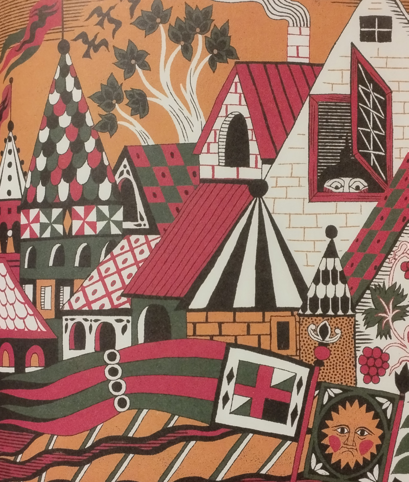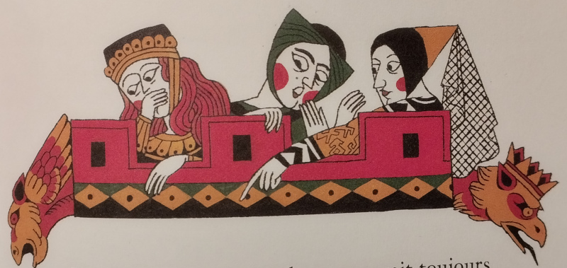 L’exemple ci-dessus montre quelque chose qu j’aime beaucoup dans son travail : les motifs ! Regardez le carrelage de la chambre, les textures des rideaux du lit, du drap qui recouvre le roi, des vêtements. Je me régale aussi de ses dessins des végétaux qui ont un côté assez art nouveau. Ils ne sont pas du tout dans un registre réaliste mais, avec un trait ou deux, un petit effet de courbe, on se dit tout de suite « mais oui, c’est un chardon…en plus mignon ».
